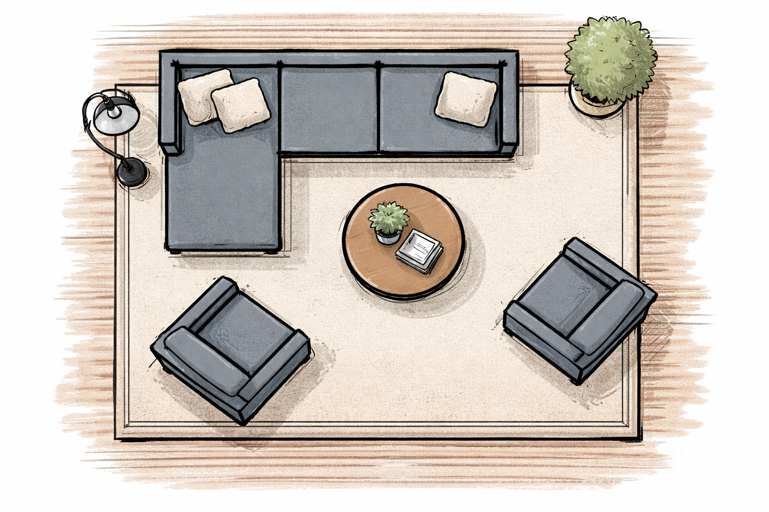 Another option is to have the rug just touching the furniture—sofa and chairs sit just on it, rather than fully on it. This works beautifully in smaller rooms or when you want a more airy feel.